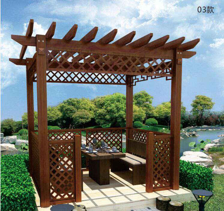 鋁合金涼亭優點: 1.采用先進的真空木紋熱轉印技術,紋理自然逼真不易褪色,好似木而勝于木! 2.鋁合金葡萄架強度高、耐腐蝕性好、造型美觀,防火阻燃無安全隱患,使用壽命長達20年以上! 3.具有高承重、防水防潮,防腐防霉防蛀、不易變形、免維護等優點,并且節能環保產品。不含苯物質,不含甲醛,為歐洲頂級環保標準,可循環使用。 4. 安裝簡單,施工便捷,不需要繁雜的工具和方法輕松搞定,多種裝飾件可選配,節省安裝時間和費用。