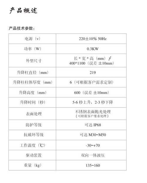 防沖撞升降柱主要由防沖撞升降柱體、氣缸、導向軸、封蓋、外箱、鎖等部分組成。升降體:采用304國標不銹鋼8mm/6mm厚鋼管加工形成,具有高強度的承重和抗撞能力;柱體內無電器、線路設置,防水、安全。